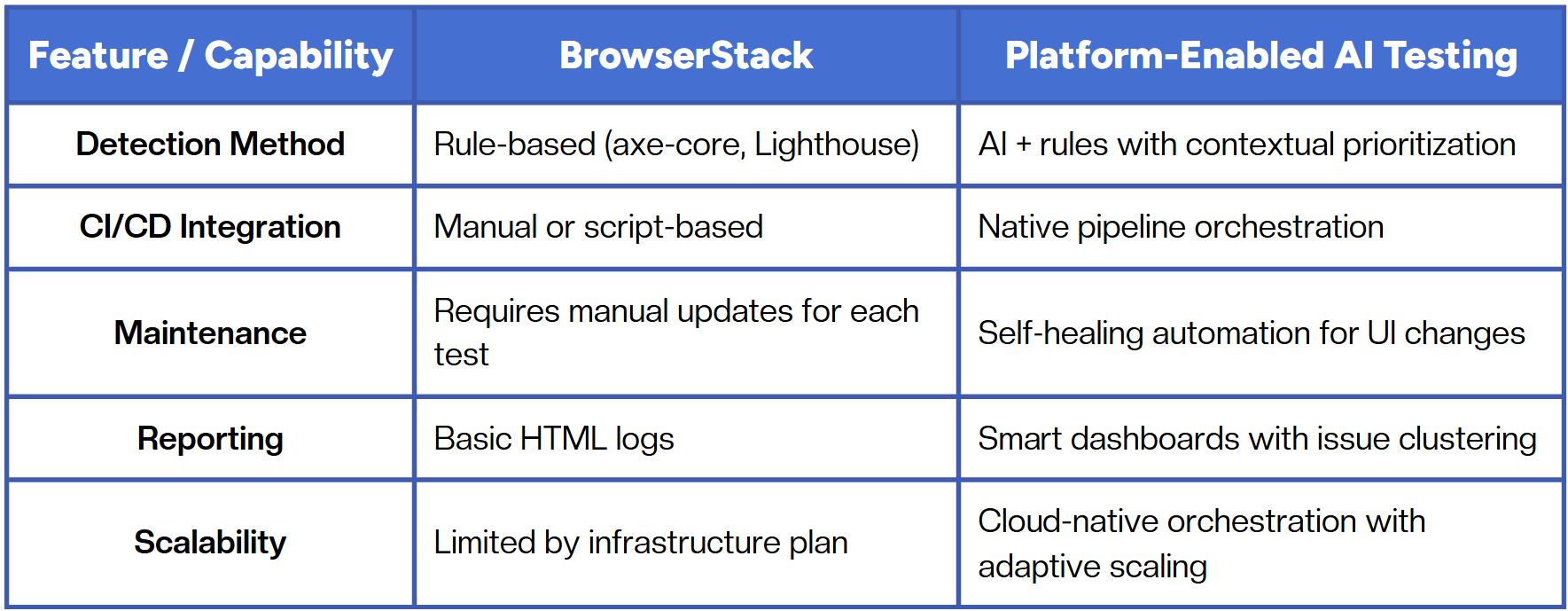 The key difference lies in intelligence vs. infrastructure. Traditional accessibility testing focuses on execution, while platform-enabled approaches focus on understanding and optimization.