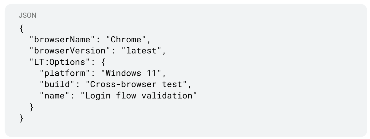 When you run automated tests in the cloud (with Selenium, Playwright, or WebDriver), you need to tell the remote system what environment to use, browser type, version, OS, device, screen resolution, and more. These configurations are known as capabilities.