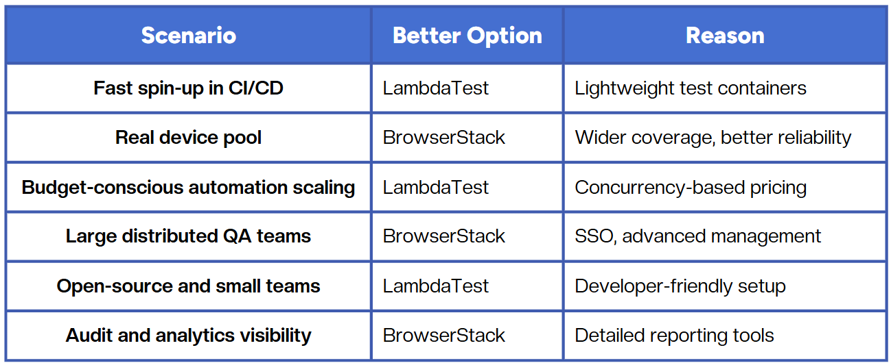 LambdaTest and BrowserStack both solve cross-browser and device fragmentation well. If your goal is speed, flexibility, and developer control, LambdaTest is often more adaptable. If you need predictability, stability, and enterprise integration, BrowserStack wins on reliability.